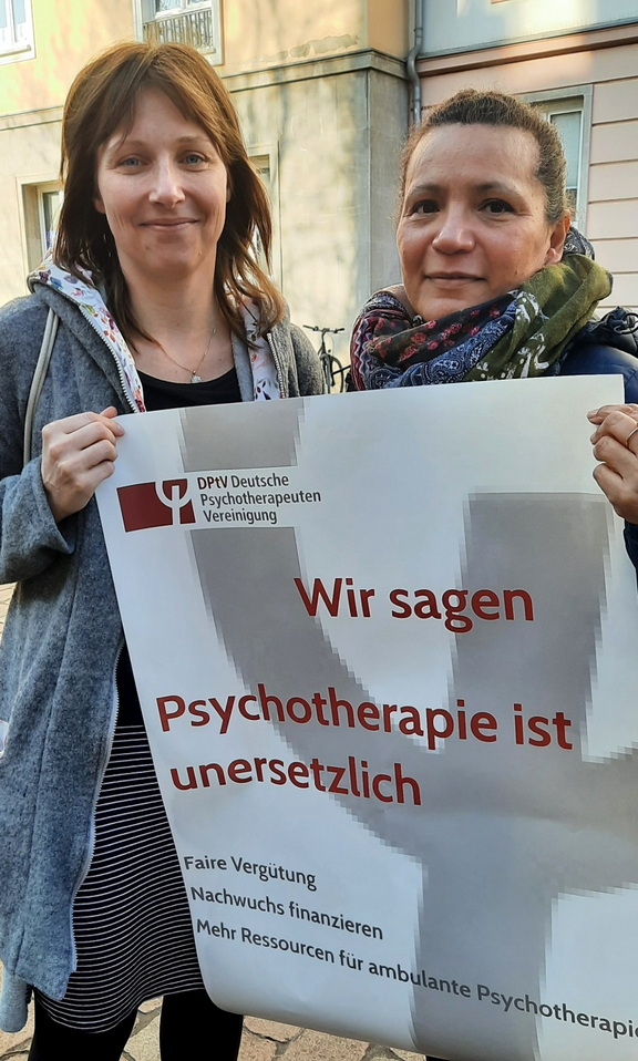 Auf der Protestaktion in Leipzig sprechen zwei KJP in Ausbildung mit uns. „Wir sind nicht nur in Sorge um uns, sondern in großer Sorge um unsere Patienten. Die Nachfrage nach Hilfe für Kinder und Jugendliche ist so immens groß, dass diese Entscheidung zu Kürzungen einem Todesstoß gleichkommt. Es braucht motivierte Kollegen im KJP-Bereich, die bereit sind, ganz viele Stellschrauben in der Therapie unentgeltlich zu drehen, weil sie schon jetzt nicht vergütet werden. Und nun kommen noch weitere Honorarkürzungen dazu. Wir stehen kurz vor dem Ende unserer Ausbildung zu Kinder- und Jugendlichenpsychotherapeutinnen. Diese Ausbildung hat zirka 30.000 Euro gekostet. Diese Schulden bringen wir also mit bevor wir ins Berufsleben starten. Wir haben auch Familien und Kinder, aber keine Sicherheit, wie unser Verdienst in der Niederlassung aussieht. Wir möchten Kinder und Jugendliche gut versorgen, aber zu fairen Bedingungen.“