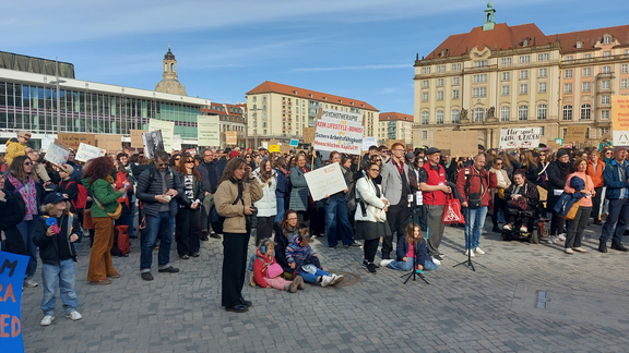In den vergangenen Wochen gingen zum Beispiel in Magdeburg, Chemnitz, Leipzig, Erfurt und Dresden hunderte Kolleginnen und Kollegen auf die Straße, um auf die ungerechte Honorierung ihrer Arbeit aufmerksam zu machen. OPK-Präsident Dr. Gregor Peikert und Vizepräsidentin Dr. Sabine Ahrens-Eipper unterstützten die Kolleginnen und Kollegen dabei durch Redebeiträge. Sie sprachen klar dagegen an, dass Krankenkassen Psychotherapie als Gesundheitsleistung für weniger Wert halten. „Im Denken der Krankenkassen-Funktionäre ist die Behandlung psychischer Erkrankungen noch immer weniger wert als die Behandlung körperlicher Erkrankungen. Man glaubt, Psychotherapie sei eine nette Zugabe zu Gesundheitsleistungen, die nicht wirklich notwendig sei“, spricht der OPK-Präsident zu den zirka 300 Menschen auf dem Altmarkt in Dresden.